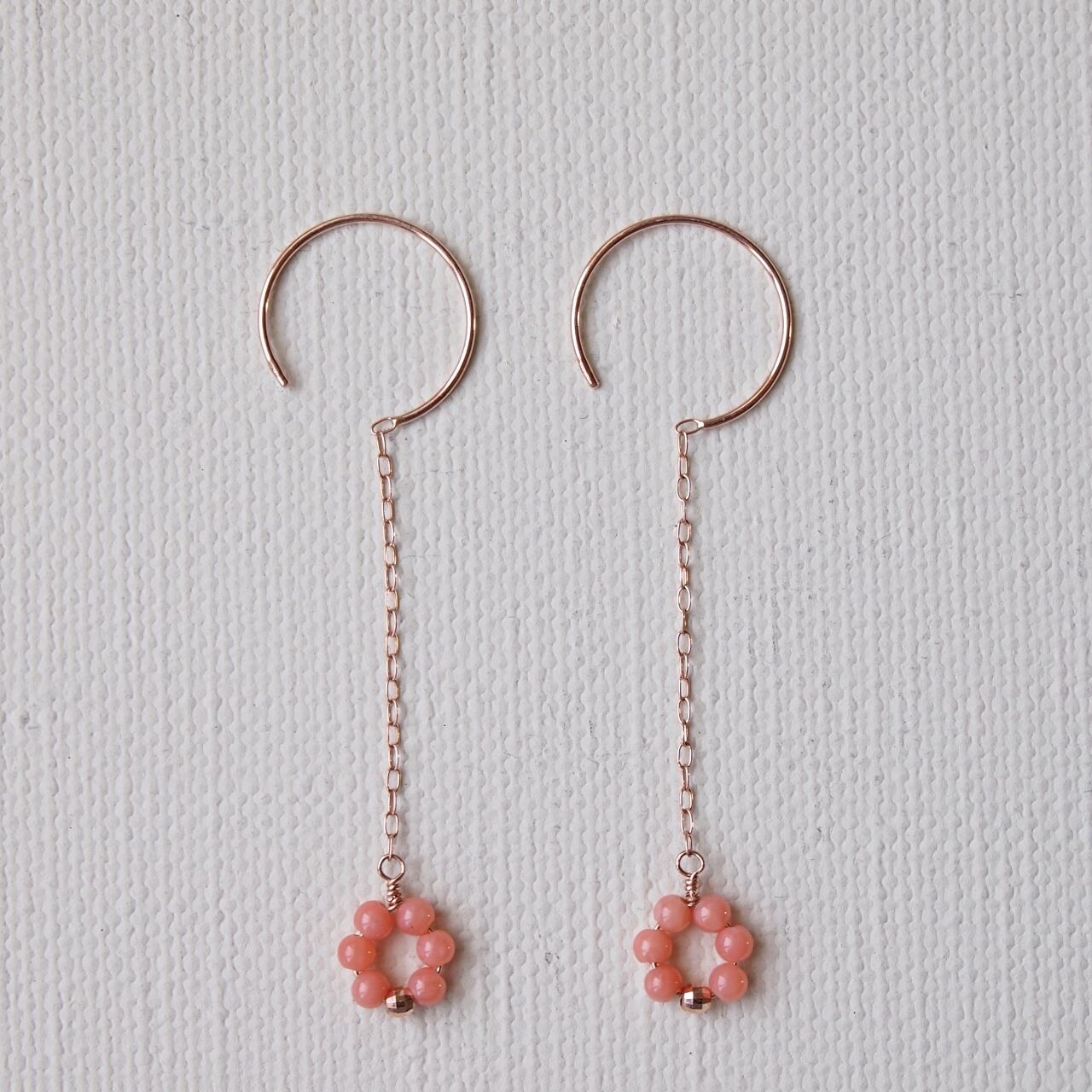 チェーン部分まで耳穴を通せば、フープと珊瑚が重なって華やかな印象に♪