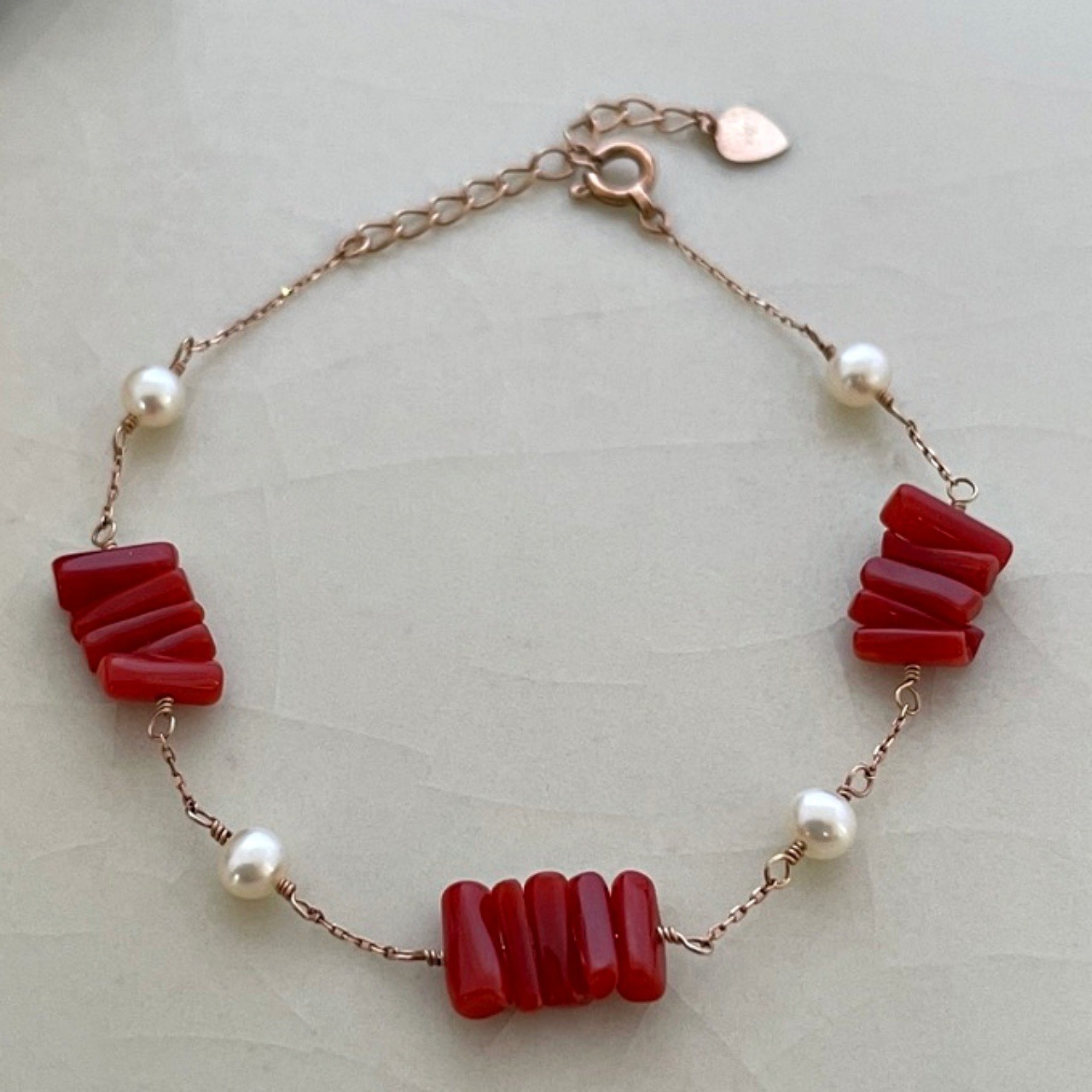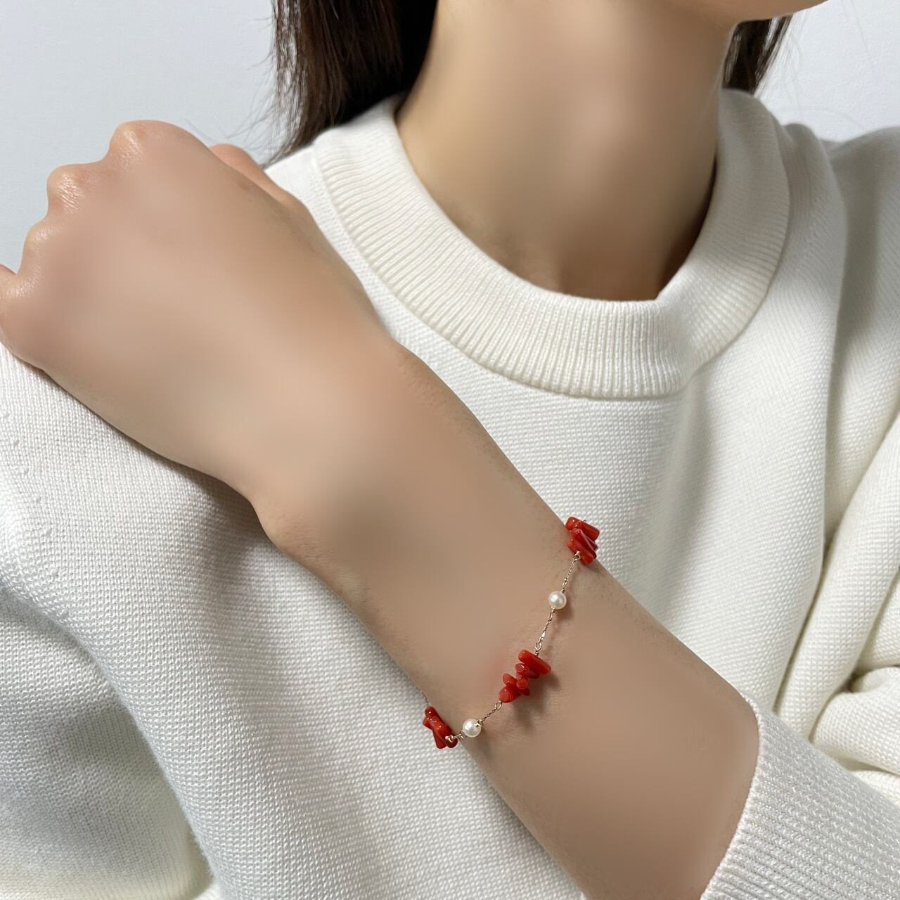 K10ピンクゴールドの華奢なチェーンに地中海珊瑚の赤が華やかに映える。