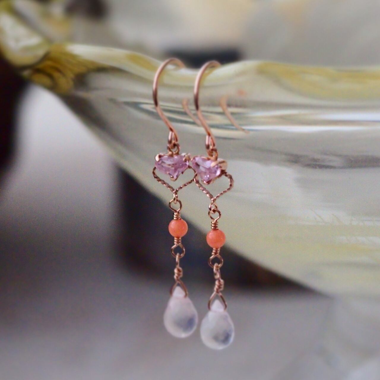 搖れるたびにきらめくピンク系の貴石の組み合わせとハートモチーフが大人可愛い♪