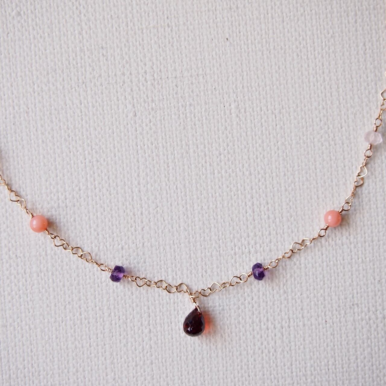ガーネットをトップに、ピンク系の天然石のグラデーションが華やかなネックレス。