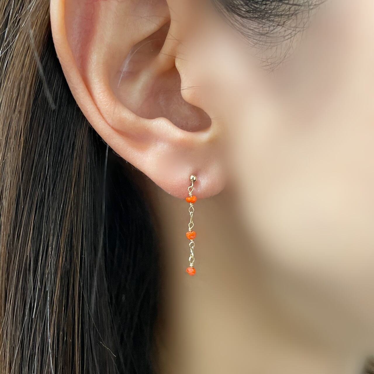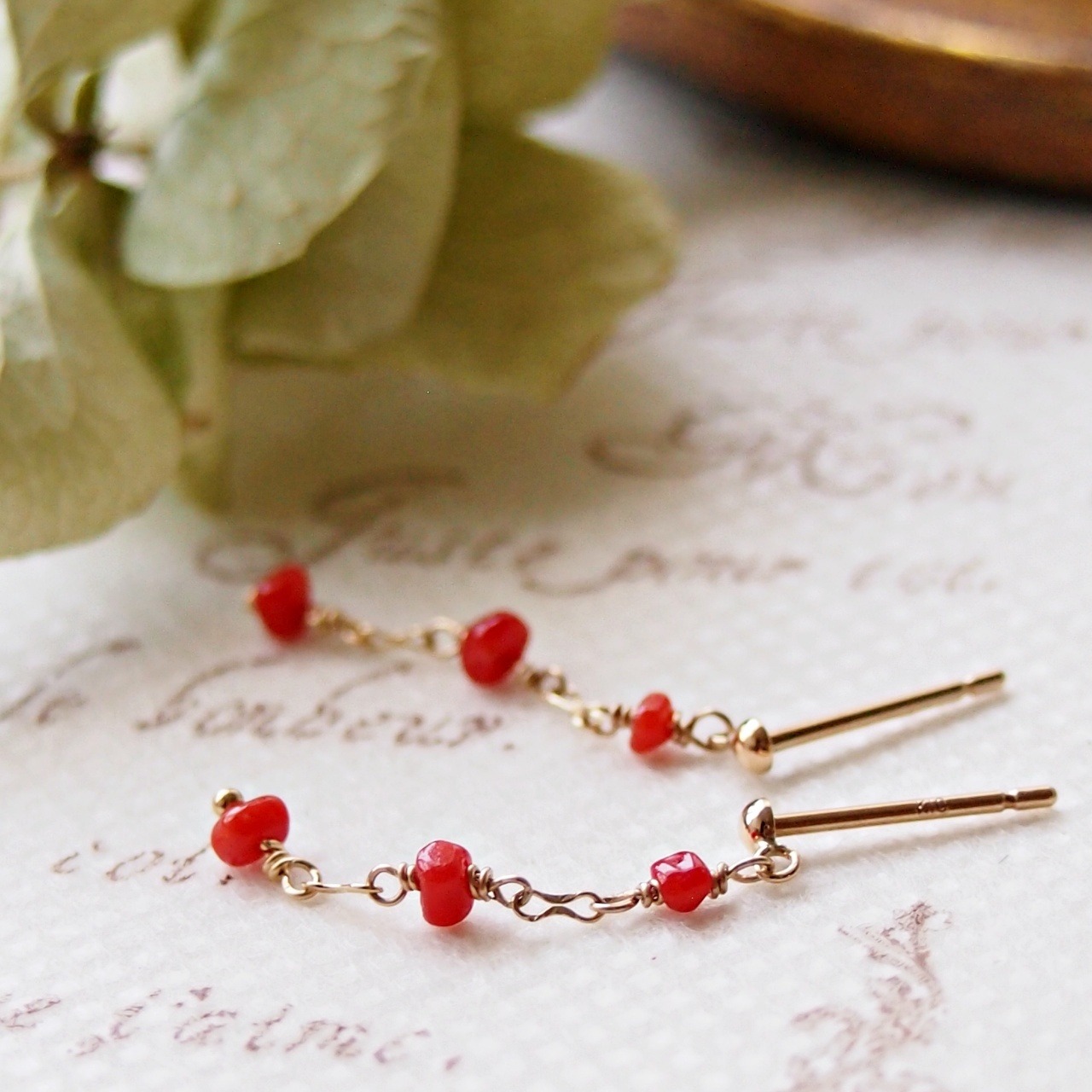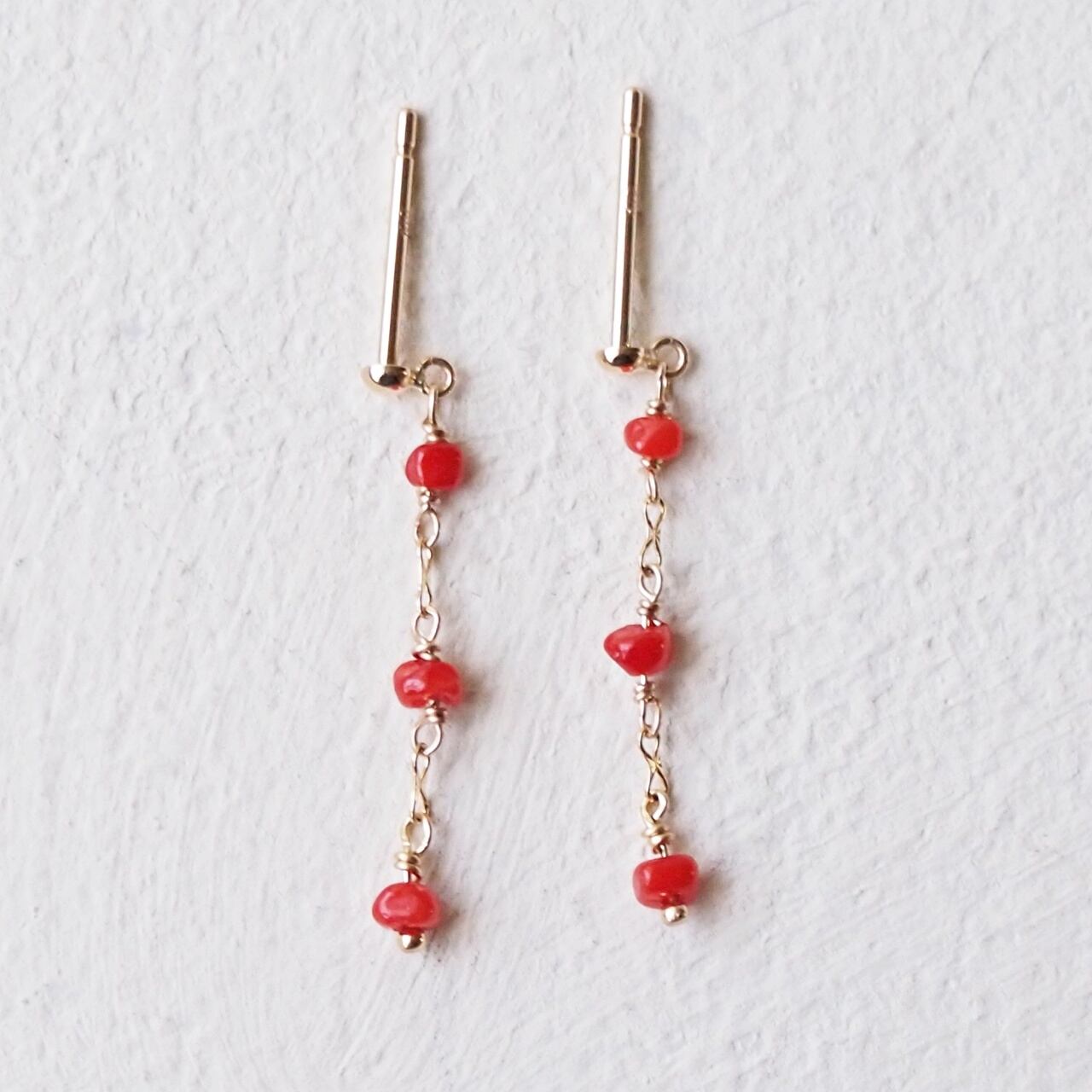 K10ゴールドピアス。自然のフォルムを活かした赤い珊瑚をあしらいました。