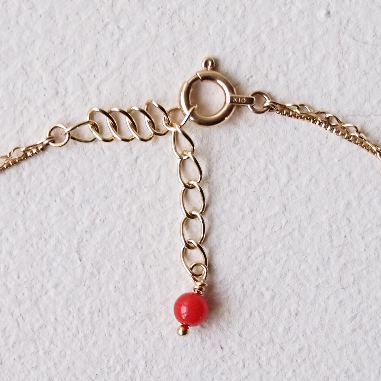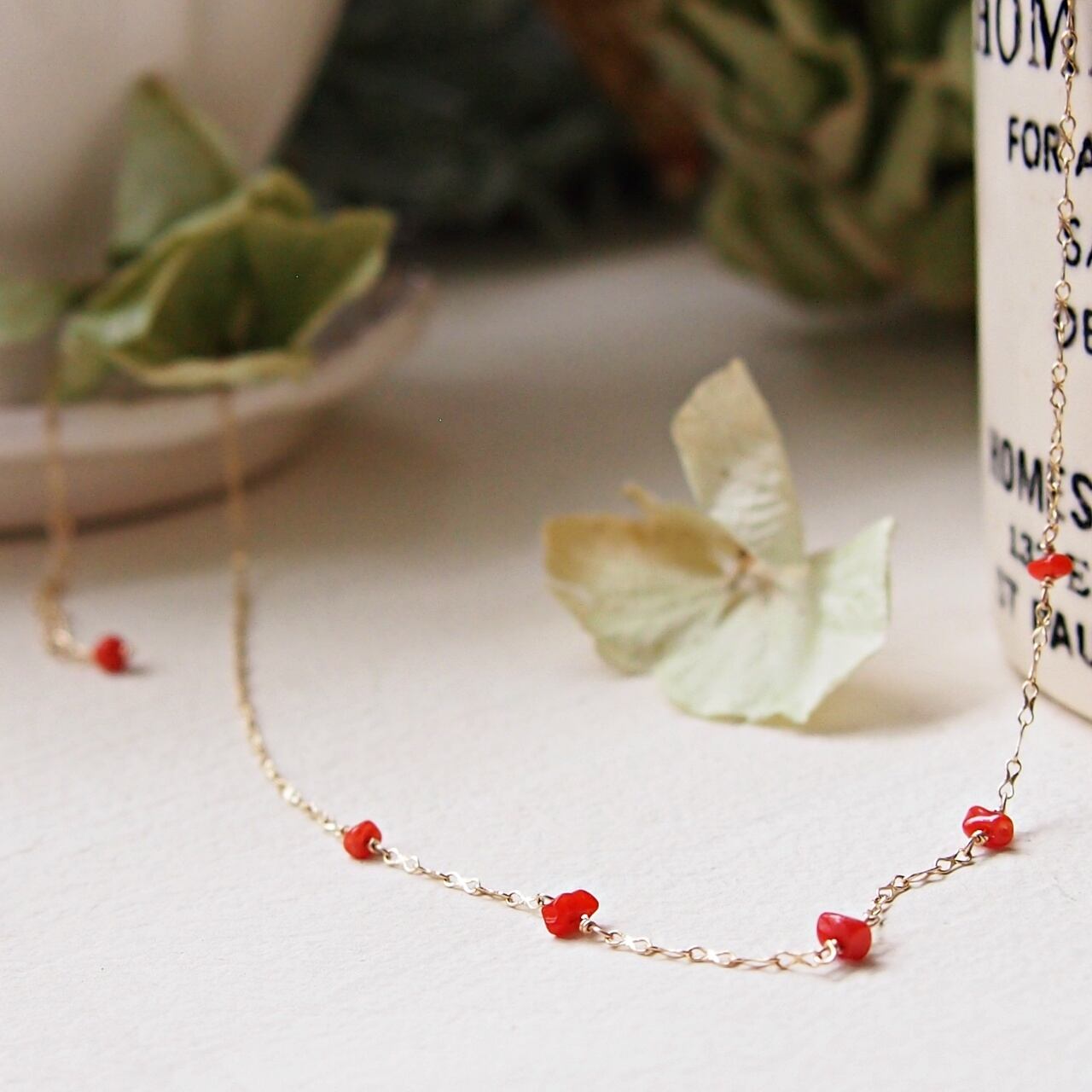 K10ゴールドの華奢なチェーンに自然のフォルムを活かした赤い珊瑚をあしらいました。
