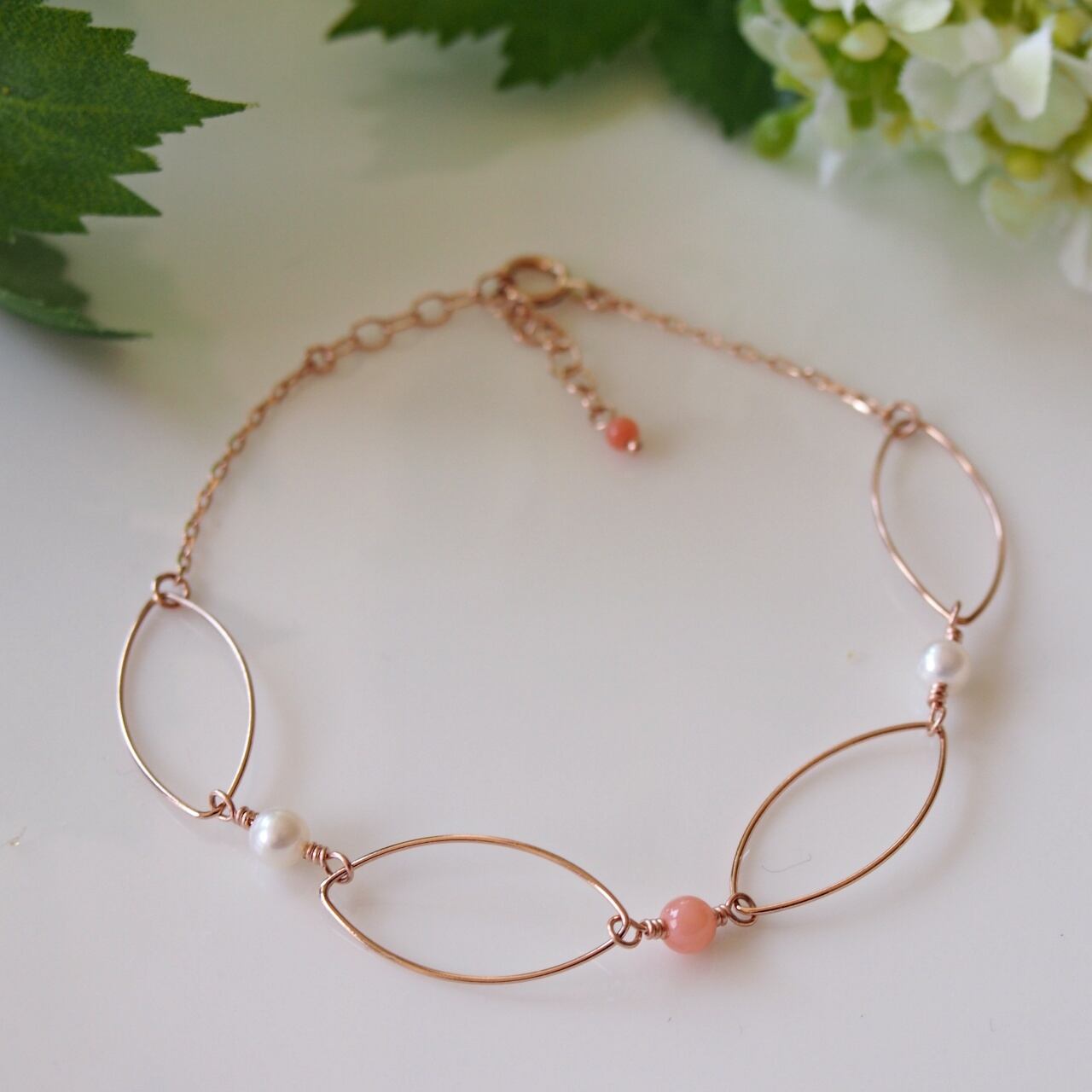 K10ピンクゴールドの華奢なラインにピンク珊瑚とパールの淡い色合いが優しいブレスレット。