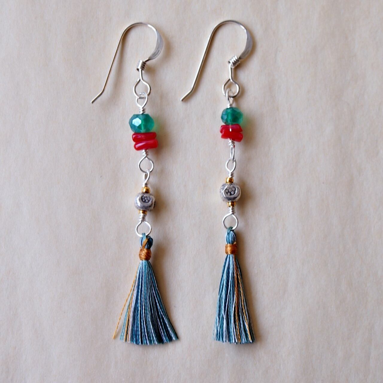 赤と緑のパッと目を引く色鮮やかなタッセルピアス。