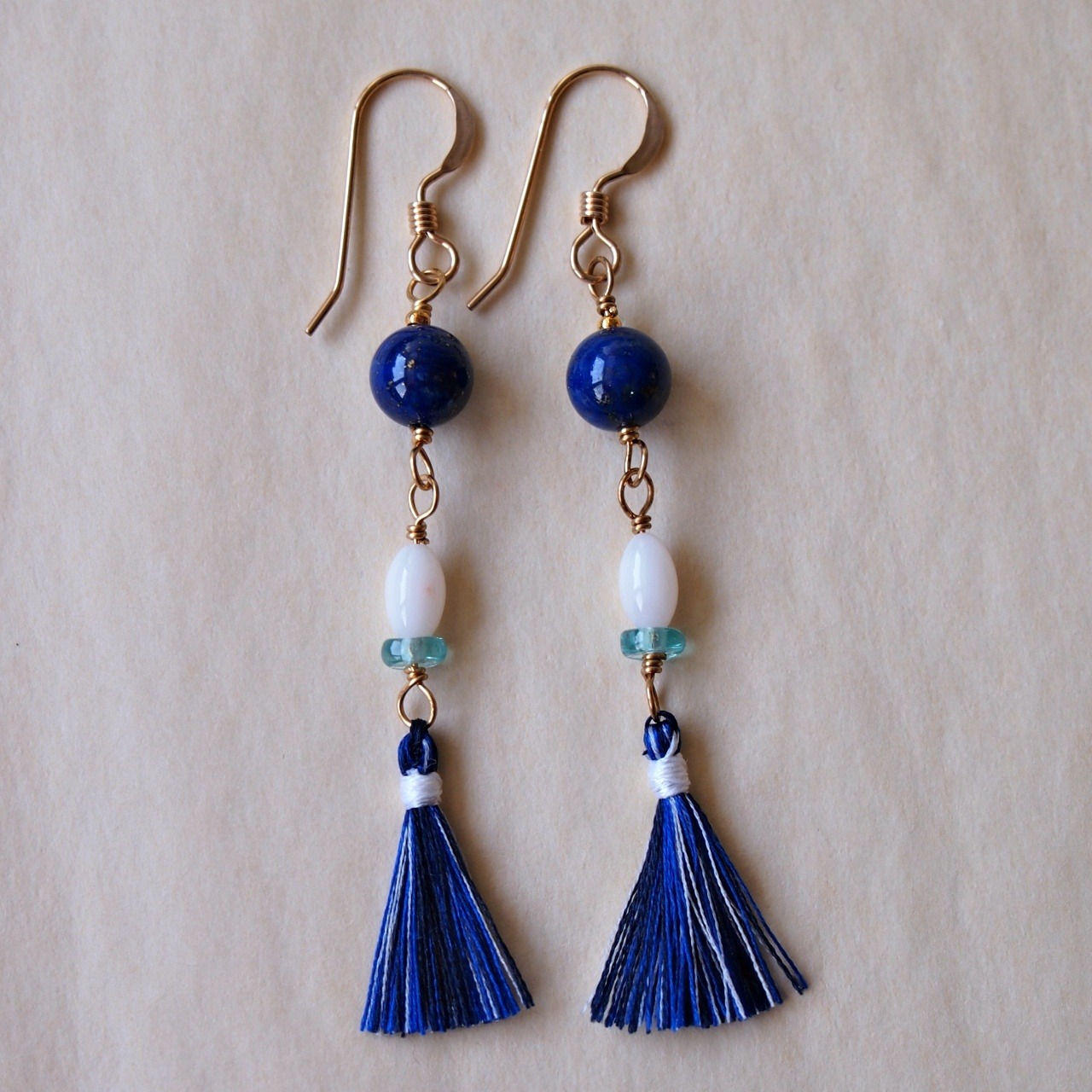 深いブルーと白珊瑚のコントラストが星空を思わせる神秘的なタッセルピアス。