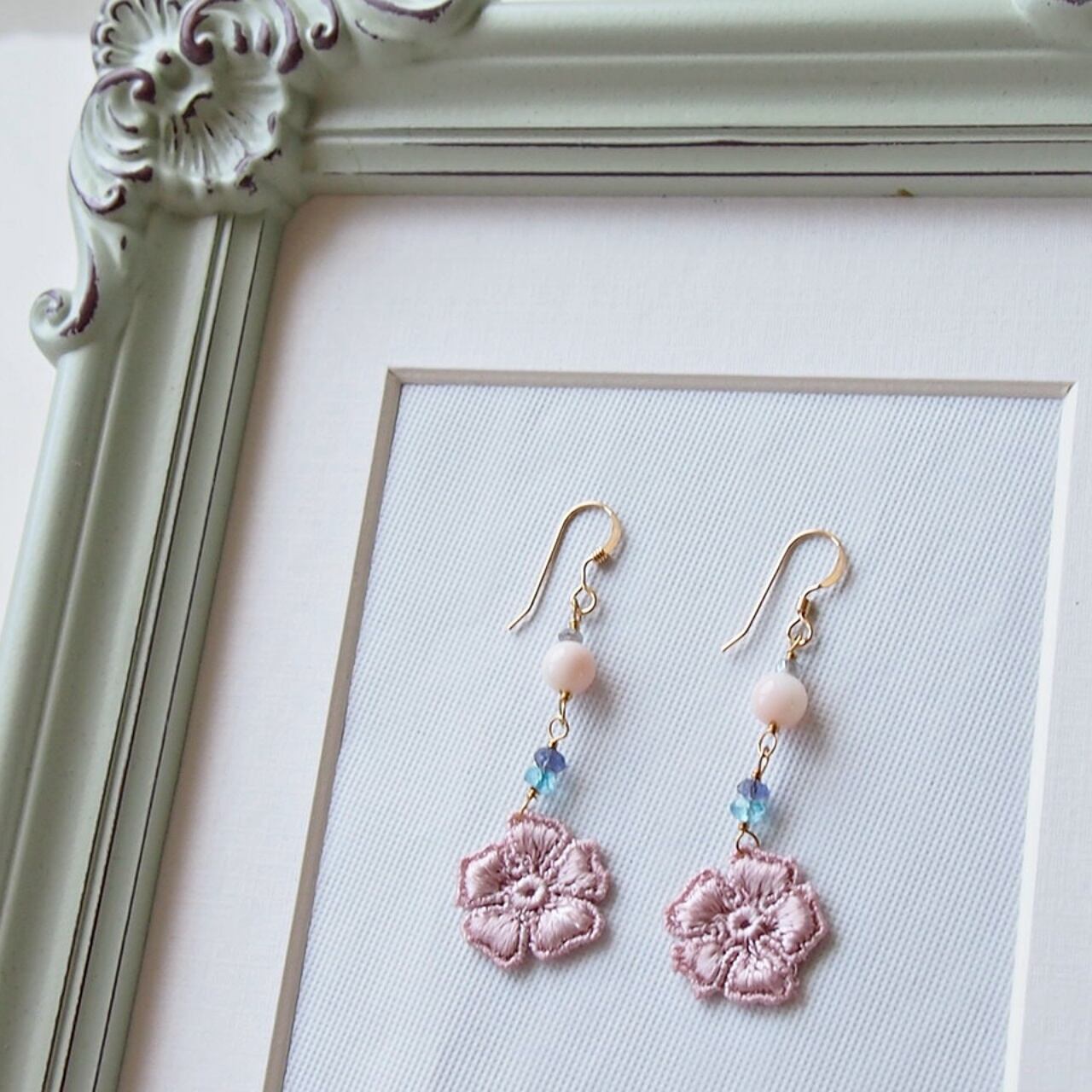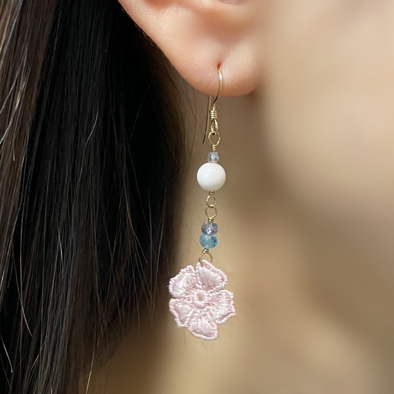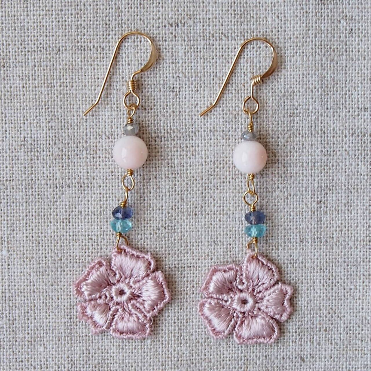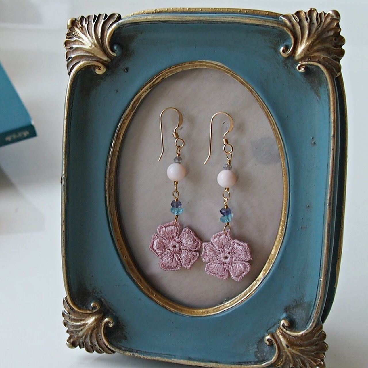 ピンク珊瑚とブルートパーズを組み合わせ、愛らしいお花のレース(国産綿)を使った、大人可愛いピアスに仕上がりました♪