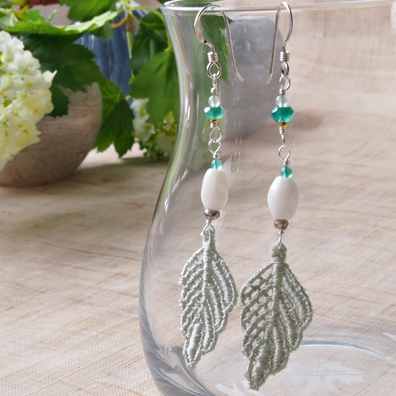 ミントカラーとホワイトの爽やかに揺れるリーフピアスで心地よい風を感じて♪