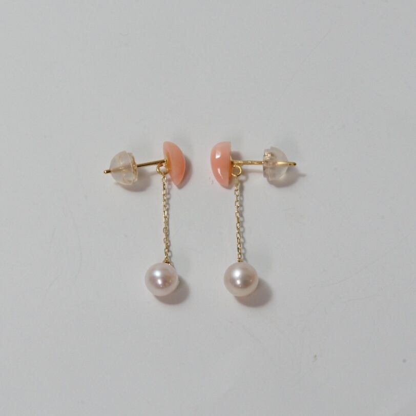 淡いピンク珊瑚が女性らしい輝きを放つエレガントなピアスです。