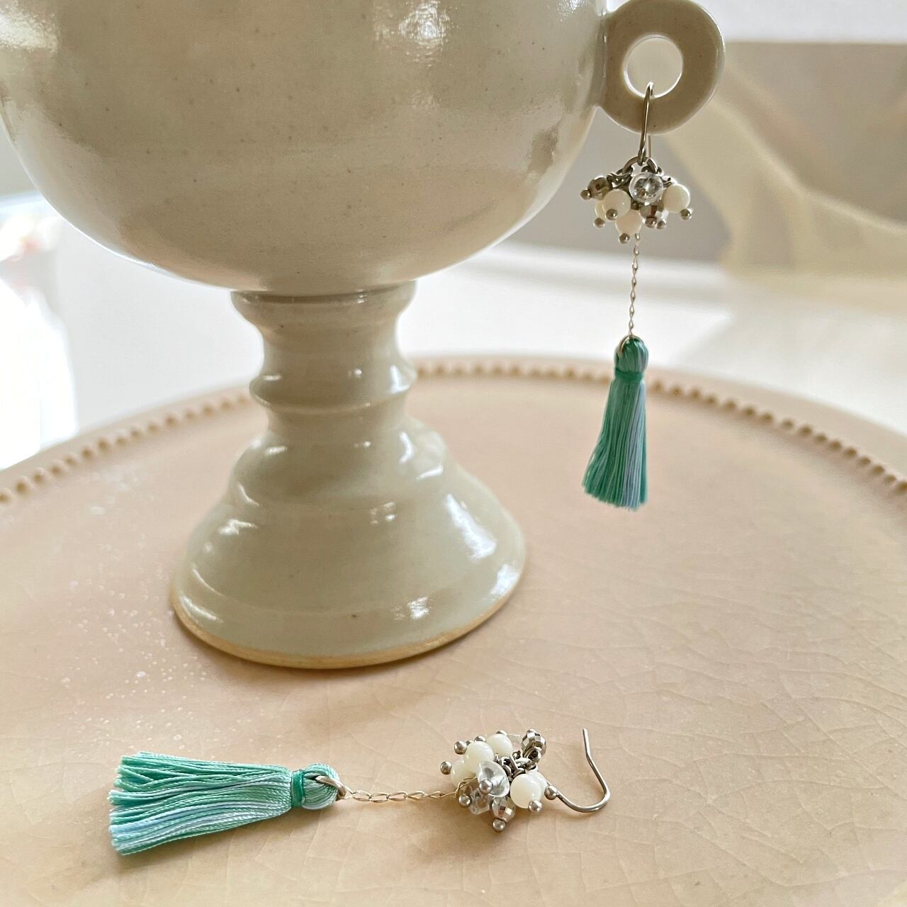 白珊瑚とアクアマリンが耳元で軽やかに揺れるミントブルーの爽やかタッセルピアス。