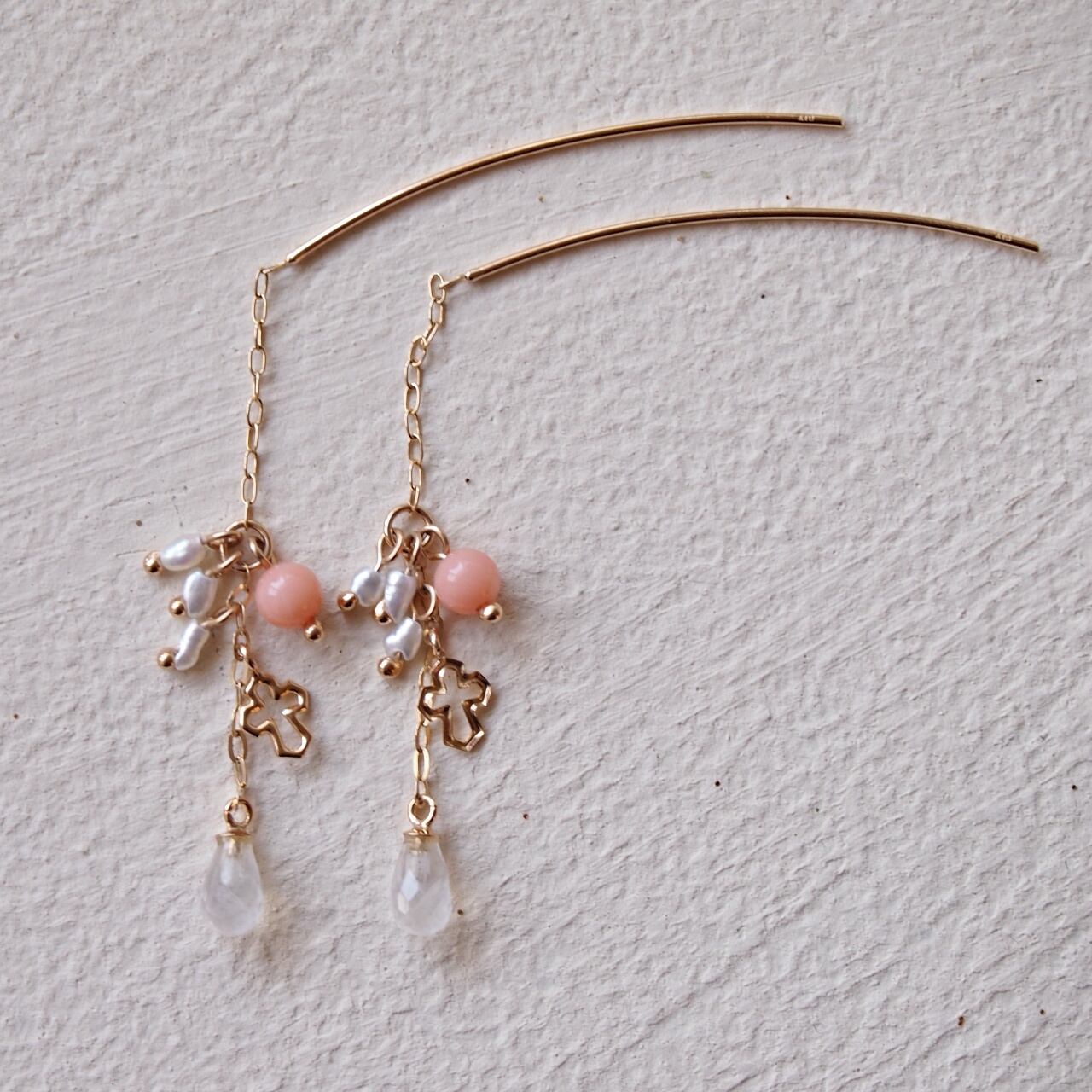 ピンク珊瑚とブルームーンストーンの優しい色の組み合わせにクロスのチャームを添えて♪